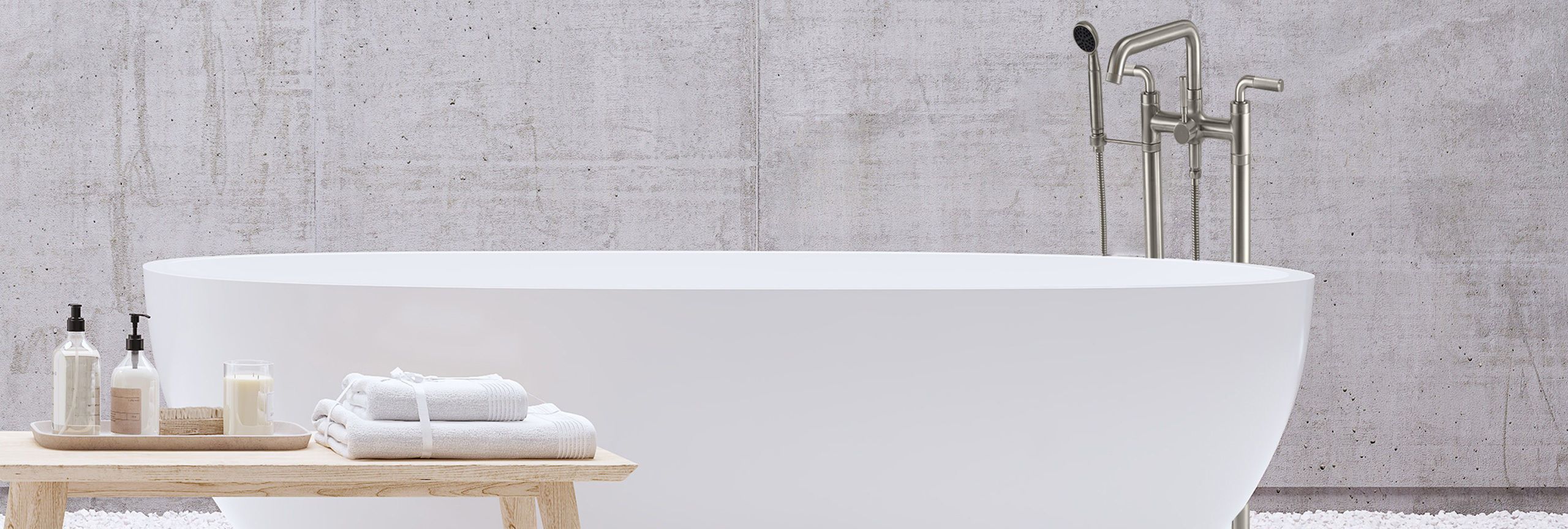 The Descanso series tub filler is distinctively contemporary with hash mark-textured knurling detail on handles and spout adding a raw, industrial chic edge.